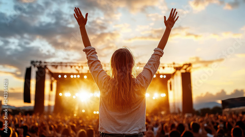 festival goer with hands raised, enjoying vibrant sunset atmosphere