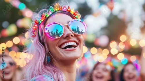 Festival Vibes: A vibrant, smiling woman with pink hair and a colorful crown dances amidst a lively music festival, enjoying the festive atmosphere and infectious energy.