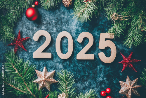 Festive 2025 Surrounded by Christmas Ornaments and Pine Branches