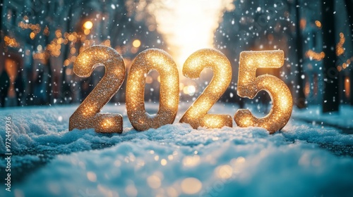 Festive 3D Golden "2025" Numbers on Sunny Snowy Day with Park Background and Blurred Passersby