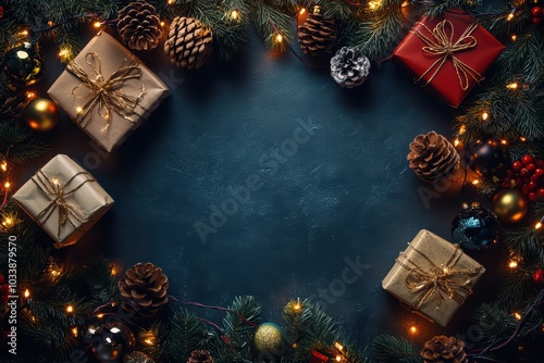 Festive arrangement of Christmas gifts, pine cones, and decorations, creating a warm holiday atmosphere suitable for seasonal imagery.