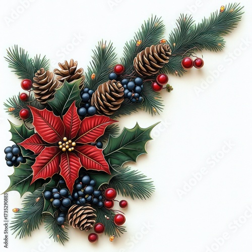 Festive arrangement of pine branches, pine cones, red poinsettia flower, holly leaves, and clusters of red and blue berries on a white background