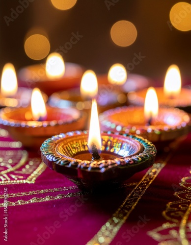 Festive Array of Glowing Diwali Oil Lamps on Ornate Fabric