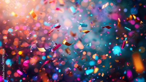 Festive atmosphere with vibrant, floating confetti particles in a blurred bokeh background, capturing the essence of celebration and joy.