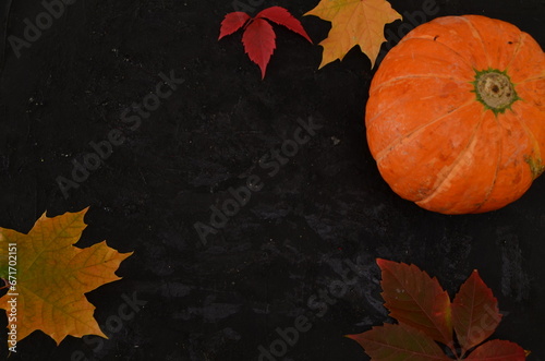 Festive autumn decor from pumpkins, berries, apple flowers leaves on a yellow, beige background. Concept of Thanksgiving day or Halloween. Flat lay autumn composition with copy space.