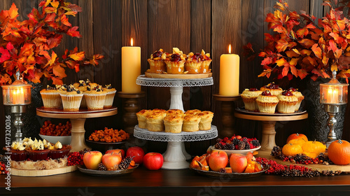 Festive autumn dessert display with muffins, cakes, candles and fruits