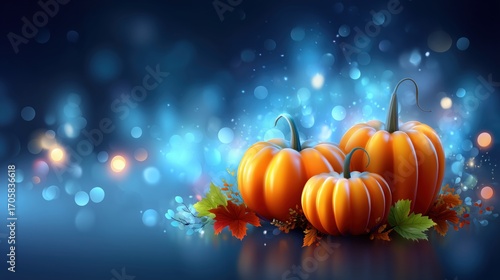 Festive Autumn Pumpkins and Leaves on Sparkling Blue Background