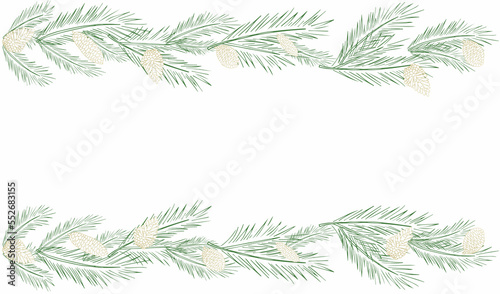 Festive background, web banner, postcard, poster, greeting card with fir branches, pine cones and balls. with space for text. Elements of hand drawing.