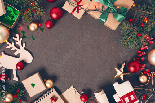 Festive background with Christmas decoration on the brown textured table