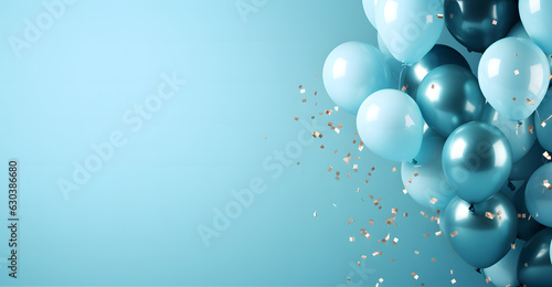 Festive banner with balloons on light blue blank background, party decoration with copy space area, panoramic holiday background