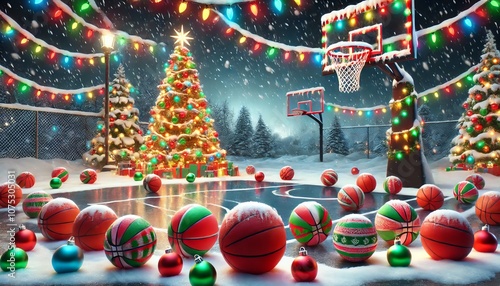 Festive Basketball Court with Christmas Tree and Lights