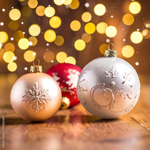 Festive baubles on wood, reflecting light from out-of-focus orbs. Shiny sphere decorations create a warm, inviting holiday atmosphere