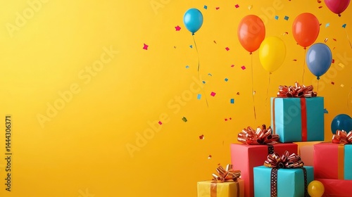 Festive Birthday Gifts with Balloons and Confetti on Yellow Background