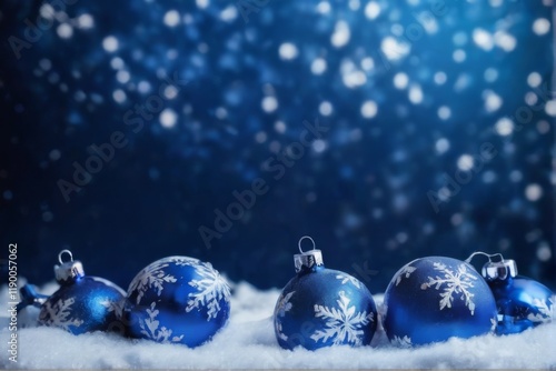 Festive Blue Christmas Baubles on Snow Bed with Bokeh Effect Holiday Decorations in Sparkling Light