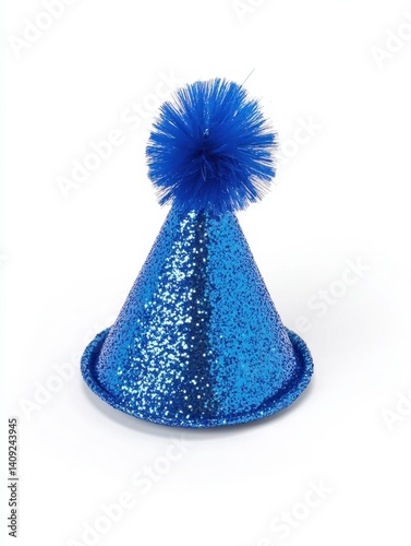 Festive blue glitter party hat with fluffy pom pom on white background for celebration event