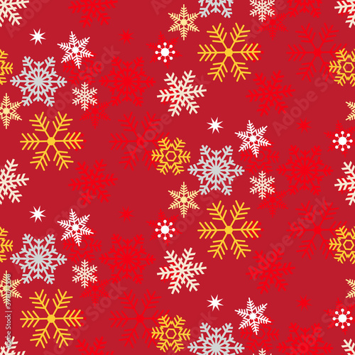 Festive bright seamless pattern of gold, silver and red snowflakes on a Burgundy background, vector for Christmas and new year design