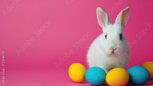 Festive bunny rabbit with colorful easter eggs on pink background