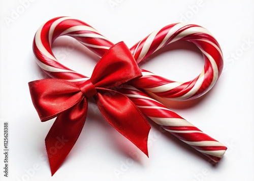 Festive Candy Cane with Red Bow on Clean White Background - Perfect for Holiday Celebrations, Christmas Decorations, and Sweet Treats Photography