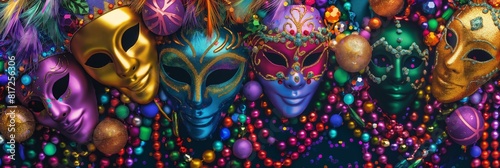 Festive carnival masks and shiny colorful beads, vibrant Mardi Gras celebration background