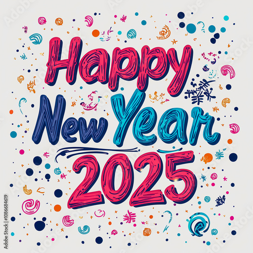 Festive Celebration Scene Featuring Colorful Text for Happy New Year 2025 with Vibrant Decorations and Cheerful Elements Illustrating New Year’s Joy