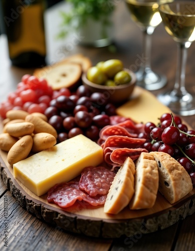 Festive charcuterie board with assorted cheeses, meats, olives, grapes, bread. Aromatic board paired with two glasses of white wine. Rustic wooden table setting for stylish, delightful event. Perfect