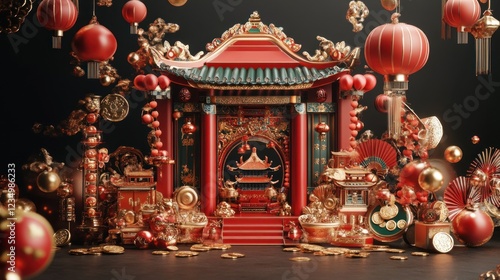 Festive Chinese New Year Temple Scene With Lanterns And Gold