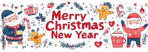 Festive Christmas and New Year greeting banner featuring Santa Claus, gingerbread man, and holiday elements