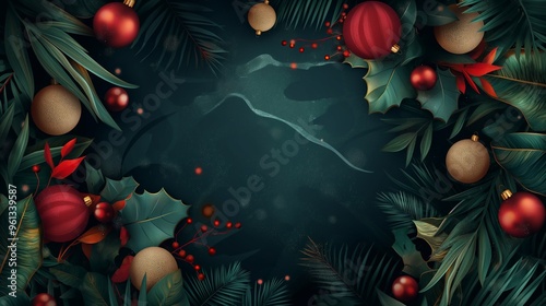 Festive christmas background featuring tropical green leaves, red and gold ornaments, and a dark, elegant atmosphere, perfect for holiday projects. Backdrop with copy space