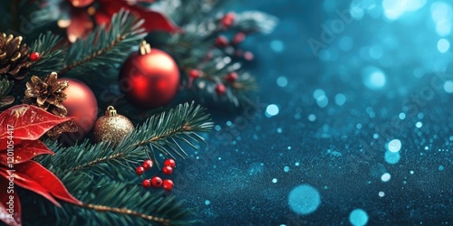 Festive Christmas background with pine branches red ornaments and gold accents on a shimmering blue bokeh backdrop creating a warm holiday atmosphere