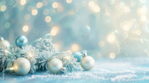 Festive Christmas Background With Silver And Blue Ornaments And Lights