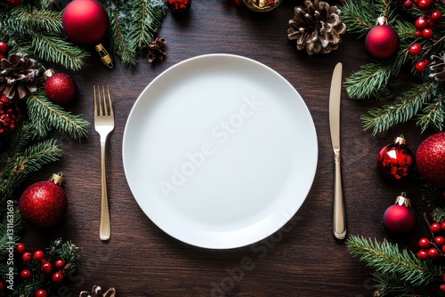 Festive Christmas banner showcasing a dinner table setting with an empty plate, cutlery, and decorative Christmas toys