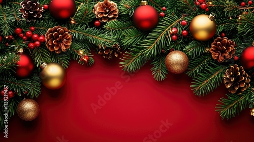 Festive Christmas Border of Evergreen Branches, Ornaments, and Pine Cones on Red Background