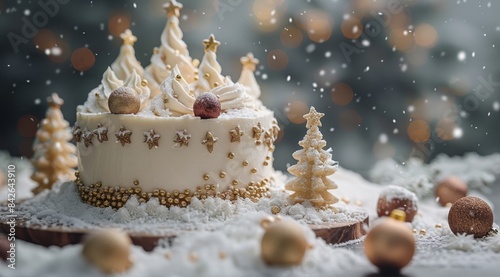 Festive Christmas Cake Decorated With Snow And Miniature Trees