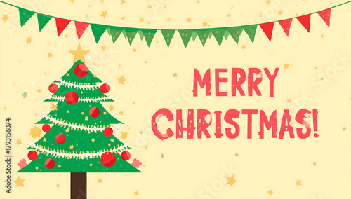 Festive Christmas Card with Decorated Tree, Bunting, and Merry Christmas Text greeting card christmas tree