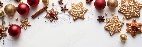 Festive Christmas cookies and decorations arranged on a white background with copy space
