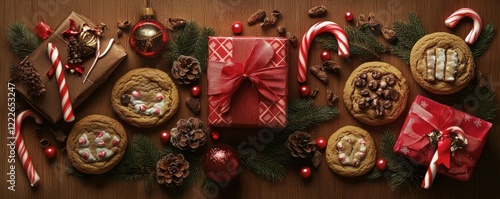 Festive christmas cookies and gifts on a wooden table with candy canes and pinecones