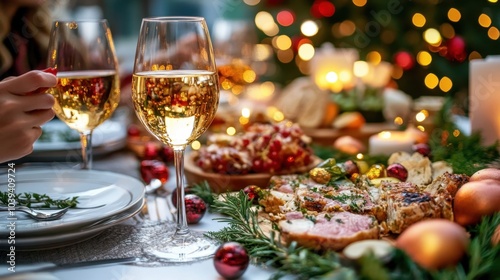 Festive Christmas Dinner Table with Wine Glasses Food and Decorations