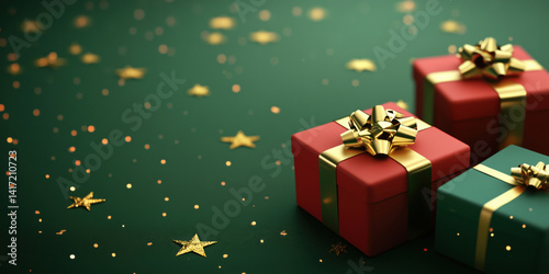 Festive Christmas gifts with golden bows on green background, surrounded by sparkling stars and glittering decorations.
