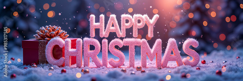Festive Christmas greeting with the words Happy Christmas written in large, pink letters against a snowy background. A red gift box is also visible in the scene.