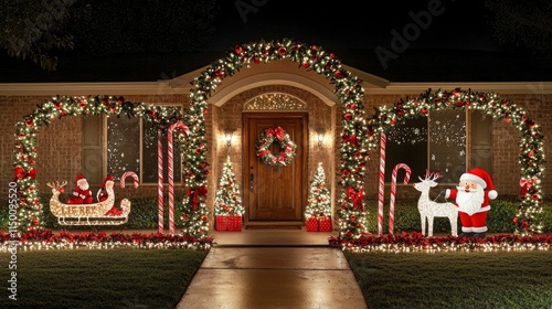 Festive Christmas House Exterior Decor with Santa, Reindeer, and Archways