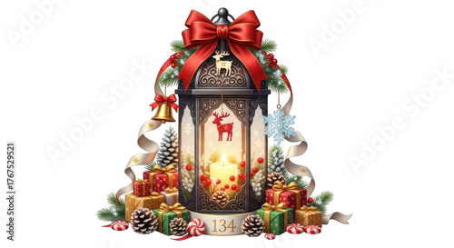 Festive christmas lantern with gifts, pine cones, and red bow isolated on transparent background