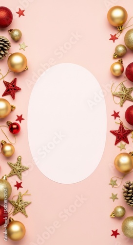 Festive Christmas Ornaments: A vibrant arrangement of gold and red ornaments, including baubles, stars, and pinecones, adorns a light pink canvas, perfectly capturing the spirit of the holiday season.