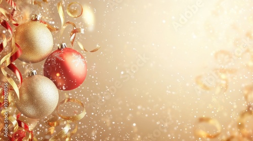 Festive Christmas Ornaments and Golden Ribbon with Snowy Background