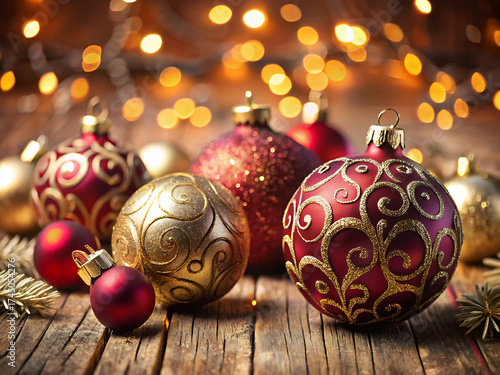 Festive christmas ornaments in red and gold colors displayed on a rustic wooden surface with bokeh lights in the background