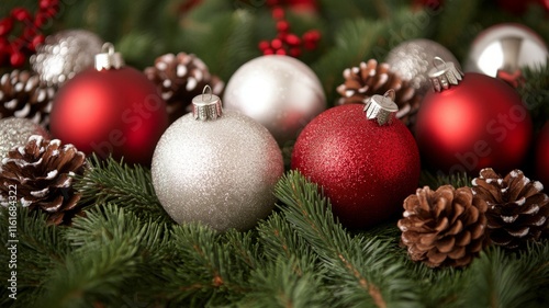 Festive Christmas ornaments nestled amongst pine branches and cones