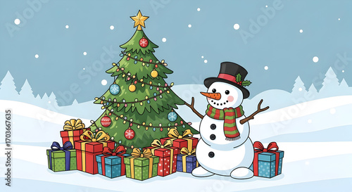 Festive Christmas Scene with Decorated Tree, Snowman and Gift Boxes in Winter Landscape