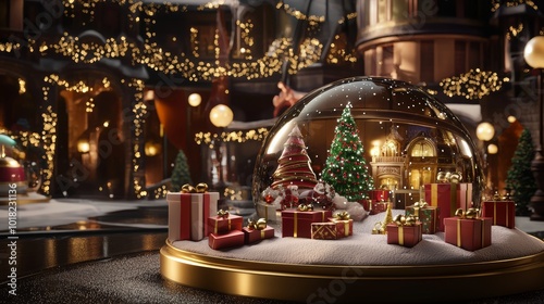 Festive Christmas scene with red ornaments, candy canes, wrapped gifts, and a snow globe, placed next to a snow-covered Christmas tree. Soft, glowing bokeh lights fill the light background.