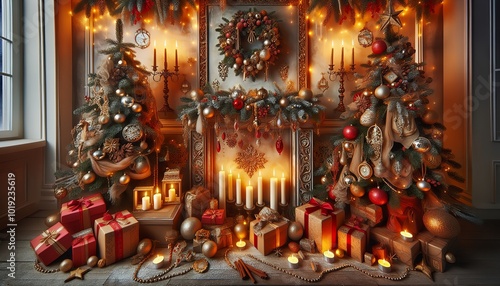 Festive Christmas setting with tree, presents and glowing atmosphere.