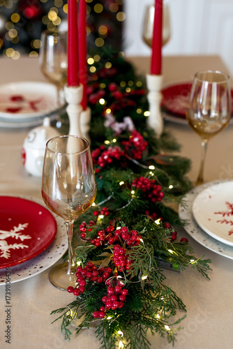 Festive Christmas table with red candles and holiday decorations