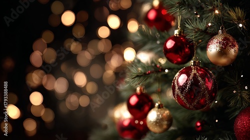 Festive Christmas tree adorned with shimmering red and gold ornaments, illuminated by warm bokeh lights creating a magical holiday atmosphere.